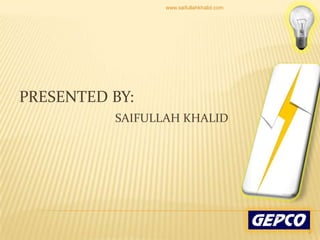 GEPCO (Gujranwala Electric Power Company) is one of the nine distribution companies in Pakistan responsible for supplying electricity to parts of Punjab province. It was incorporated in 1998 and took over the distribution network from the former Gujranwala Area Electricity Board. GEPCO's objectives include improving financial management, reducing transmission losses, ensuring reliable power supply, and facilitating customers. It operates various departments such as human resources, promotion, inquiries, and administration to carry out its functions.