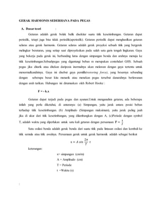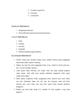 Dokumen ini membahas gerak harmonis sederhana pada pegas, menjelaskan teori getaran, gaya pemilih, dan istilah terkait seperti simpangan dan amplitudo. Percobaan dijelaskan untuk mengukur periode osilasi dan menganalisis hubungan antara masa dan periode, dengan hasil menunjukkan bahwa periode berbanding lurus dengan massa. Kesimpulan menegaskan bahwa semakin besar massa, semakin besar periode, dan disarankan untuk menggunakan alat percobaan yang lengkap untuk akurasi lebih baik.