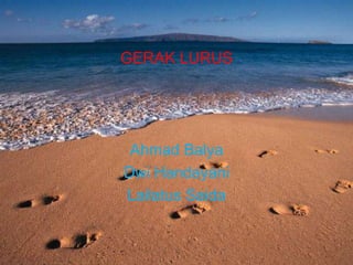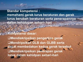 Dokumen ini membahas konsep gerak lurus, termasuk gerak lurus beraturan (GLB) dan gerak lurus berubah beraturan (GLBB). Pembahasan mencakup pengertian gerak, perbedaan antara jarak dan perpindahan, serta definisi kelajuan dan kecepatan rata-rata. Dokumen juga menyajikan persamaan yang digunakan untuk GLB dan GLBB.