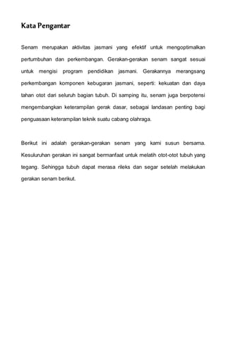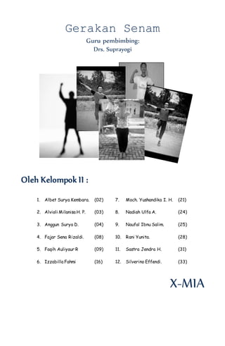 Dokumen tersebut merupakan ringkasan 12 gerakan senam yang disusun oleh kelompok II X-MIA. Gerakan-gerakan tersebut meliputi rentangan tangan, putaran bahu, lengan, dan badan, serta langkah kaki ke depan, belakang, dan samping untuk melatih otot-otot tubuh secara menyeluruh.