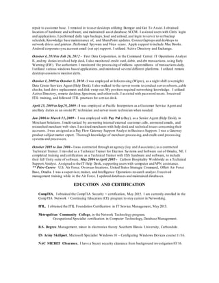 Gerald Baier has over 15 years of experience in IT leadership, operations, and customer support roles. He has a background in network administration, database management, and security and is proficient in Windows, Linux, and various networking and security tools. Baier currently works as a technical support contractor providing IT assistance to Army Reserve end users.