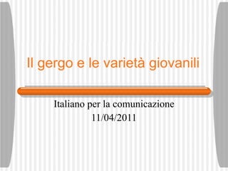 Il documento esplora il gergo e le varietà giovanili della lingua italiana, evidenziandone le origini storiche e le caratteristiche distintive. Si analizzano le funzioni del gergo, il suo uso tra i gruppi ai margini della società e la sua evoluzione nel linguaggio giovanile contemporaneo, evidenziando come elementi ludici e di identità sociale influenzino la comunicazione. Infine, vengono discussi gli influssi esterni sul linguaggio giovanile, come l'adozione di termini stranieri e tratti dialettali.