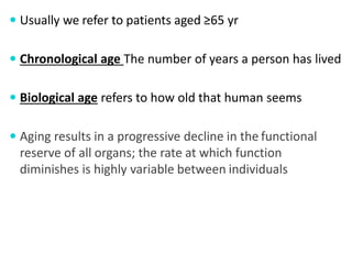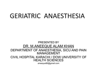 The document discusses the challenges and considerations of geriatric anesthesia, highlighting physiological changes in elderly patients that affect their response to anesthesia and surgery. Factors such as reduced organ function, polypharmacy, and increased risk of postoperative complications are emphasized, along with the importance of thorough preoperative evaluation and careful management during procedures. Additionally, it addresses adjustments needed for anesthetic doses and the benefits of regional anesthesia in geriatric patients.