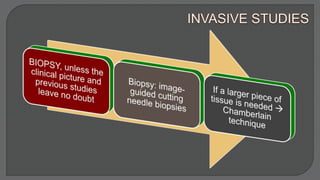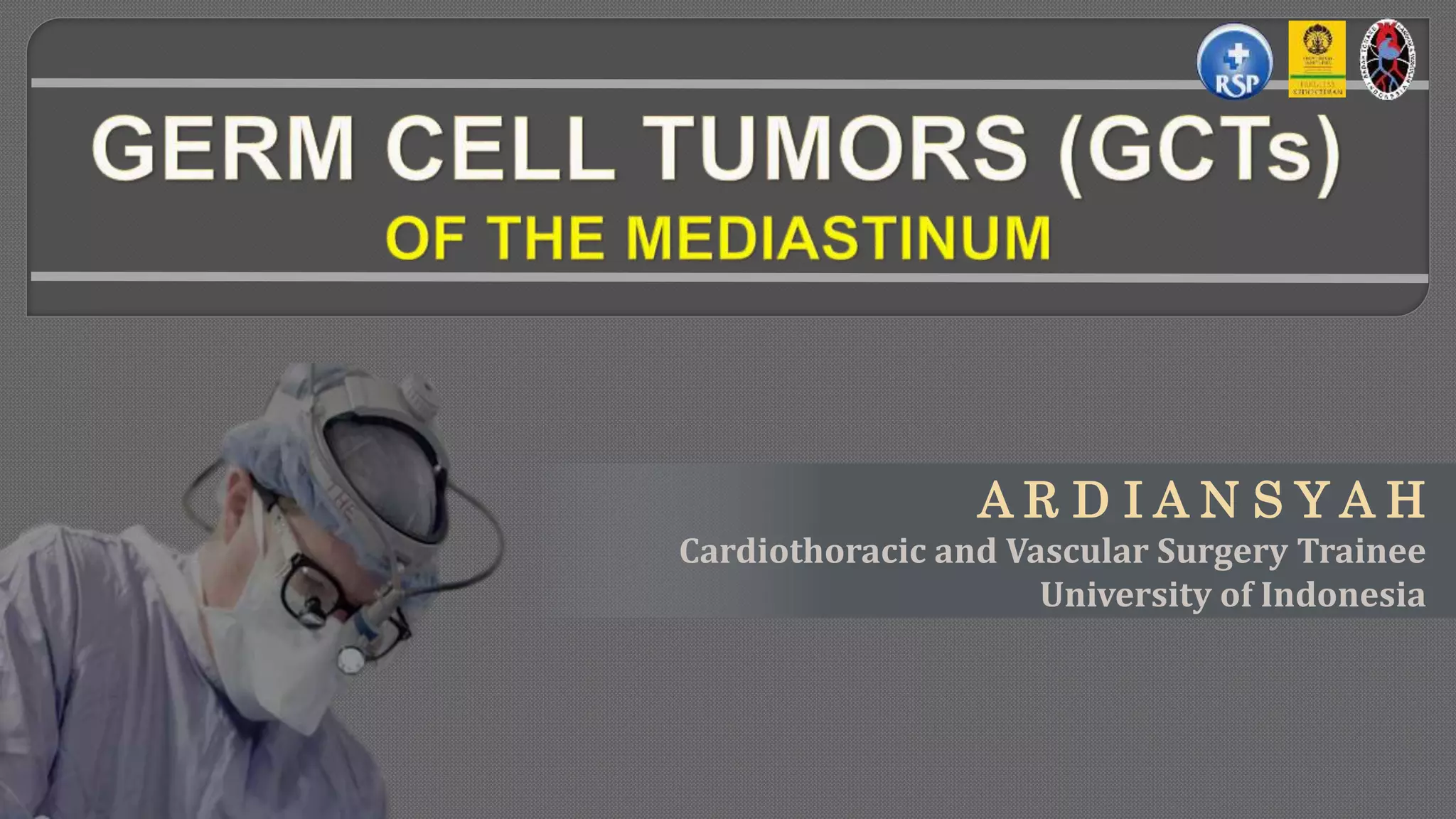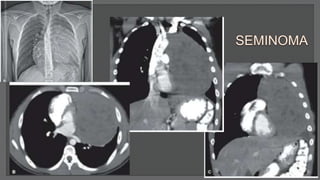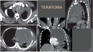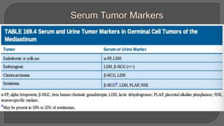 This document discusses mediastinal germ cell tumors (GCTs), including their anatomy, classification, pathologic features, diagnosis, and management. It notes that GCTs mainly affect young men and can be benign or malignant. Diagnosis involves imaging such as CT scans and tumor marker tests. Management depends on tumor type but commonly involves chemotherapy, surgery, and monitoring for recurrence. The document provides detailed information on diagnostic criteria and treatment approaches for specific GCT subtypes such as teratomas, seminomas, and non-seminomas.
