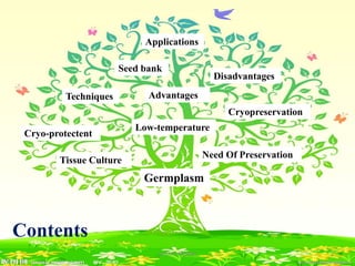 2) Cryopreservation at ultra-low temperatures in liquid nitrogen is an important ex-situ technique that can preserve germplasm long-term without subculturing. It involves preculturing plant materials, treating with cryoprotectants, and either slow-freezing or vitrification prior to storage in liquid nitrogen.