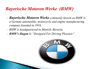 This document provides an overview of various prominent German brands across different industries, including automotive (BMW, Audi, Mercedes-Benz, Porsche), sportswear (Puma, Adidas), and luxury goods (A. Lange & Söhne, Hugo Boss). It includes information about their founding years, headquarters, and notable slogans. The document highlights Germany's significant contributions to global brands, emphasizing both manufacturing and service sectors.