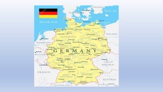 Germany has Berlin as its capital city and uses the euro as currency. Some key facts are that renewable energy is a leading power source, Fanta originated in Germany, and college education is free. German cuisine is known for heavy, rich meals featuring meat and creamy sauces along with bread and beer. Geographically, Germany is located in central Europe and borders several neighboring countries. Some traditional ingredients include asparagus, kohlrabi, cherries, ham, and cheeses like quark. Popular dishes include potato salad, sauerkraut, schnitzel, and Black Forest cake.