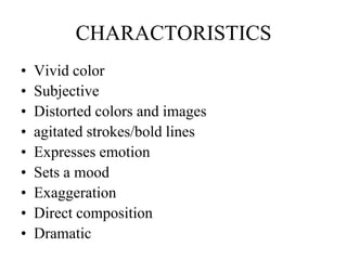 German Expressionism was an artistic movement that flourished in Germany between 1905 and 1935. It was characterized by vivid colors, subjective and distorted images, and agitated brushstrokes used to express emotion and set a mood. Two major Expressionist groups were Die Brücke and Der Blaue Reiter. Die Brücke was based in Dresden and expressed radical social views through works inspired by Primitivism. Key artists included Kirchner, Schmidt-Rottluff, and Heckel. Der Blaue Reiter was formed in Munich and centered around Kandinsky and Marc, focusing on injecting art with spiritual values using color. Major influences included Van Gogh and Munch, known