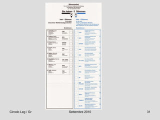 Il sistema elettorale tedesco è un sistema parlamentare bicamerale che combina il voto diretto nei collegi uninominali con un sistema proporzionale personalizzato. Gli elettori hanno due voti, uno per il candidato e uno per il partito, e la rappresentanza è influenzata dalla clausola di sbarramento e da meccanismi di correzione per evitare l'eccessiva frammentazione politica. Nonostante alcune critiche, il sistema è considerato efficace perché garantisce una buona stabilità di governo e rappresentatività.