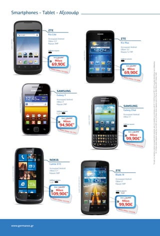 - Aξεσουάρ ZTE Kis Lite ZTE Kis Plus κωδικός: 20272616 ∆ιαθέσιµα χρώµατα Λειτουργικό Android Οθόνη 3.5” Κάµερα 3,2 MP Από 89,90€ Μόνο ∆ιαθέσιµα χρώµατα 69,90€ Από 99,90€ Μόνο ‘Aτοκες ∆όσεις : 12χ 5 ,83€ 69,90€ ‘Aτοκες ∆όσεις : 12χ 5 ,83€ SAMSUNG Λειτουργικό Android Οθόνη 3” Κάµερα 2MP SAMSUNG Galaxy Chat ∆ιαθέσιµα χρώµατα Λειτουργικό Android Οθόνη 3” κωδικός: 20274837 κωδικός: 20265685, 20266710 Galaxy Y Από 109,90€ Μόνο 94,90€* ∆ιαθέσιµα χρώµατα ‘Aτοκες ∆όσεις : 12χ 7 ,91€ Από 149,90€ Μόνο 99,90€* ‘Aτοκες ∆όσεις : 12χ 8 ,33€ NOKIA Λειτουργικό Android Οθόνη 3.7” Κάµερα 5MP ∆ιαθέσιµα χρώµατα Από 149,90€ Μόνο 109,90€* ‘Aτοκες ∆όσεις : 12χ 9 ,16€ ZTE Blade III κωδικός: 20273293, 20273415 κωδικός: 20270735, 20270829 Lumia 610 Λειτουργικό Android Οθόνη 4” Κάµερα 5MP ∆ιαθέσιµα χρώµατα Από 159,90€ Μόνο 99,90€ ‘Aτοκες ∆όσεις : 12χ 8 ,33€ www.germanos.gr *Οι τιµές των προϊόντων ισχύουν για αγορά σκέτης συσκευής, µόνο την περίοδο των εκπτώσεων από 01/11/2013 έως και 09/11/2013 και µέχρι εξαντλήσεων των αποθεµάτων. Οι 12 Άτοκες ∆όσεις αφορούν αγορά άνω των 60€, ενώ οι 24 Άτοκες ∆όσεις αφορούν µόνο το iPad µε οθόνη Retina WiFi+Cellular 16GB. κωδικός: 20287104 Λειτουργικό Android Οθόνη 3.5” Κάµερα 3MP