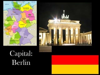 Germany has a population of 82.3 million people, with 89% living in cities. It is governed by Chancellor Angela Merkel through a parliamentary system. Major cities include Berlin, Frankfurt, and Munich. Germany has a strong economy and is a top producer of cars, machinery, and chemicals. The Berlin Wall was built in 1961 and dismantled in 1989. Germany is also known for its contributions to classical music, beer, and gummy bears.