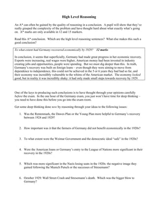 The document provides information about important people, events, economic developments, and cultural changes in Germany between 1924 and 1930 during the Weimar Republic. It mentions key figures like Stresemann and Bruning, economic policies and agreements like the Dawes Plan, Young Plan, and Rentenmark that addressed hyperinflation, cultural movements like the Bauhaus and New Objectivity, and social changes including the rise of nightclubs and changing attitudes. The multiple questions ask the student to choose details from the document or their own knowledge to answer questions about solving hyperinflation, improving lives, stabilizing the economy, the government's popularity, and Berlin's culture in the 1920s.