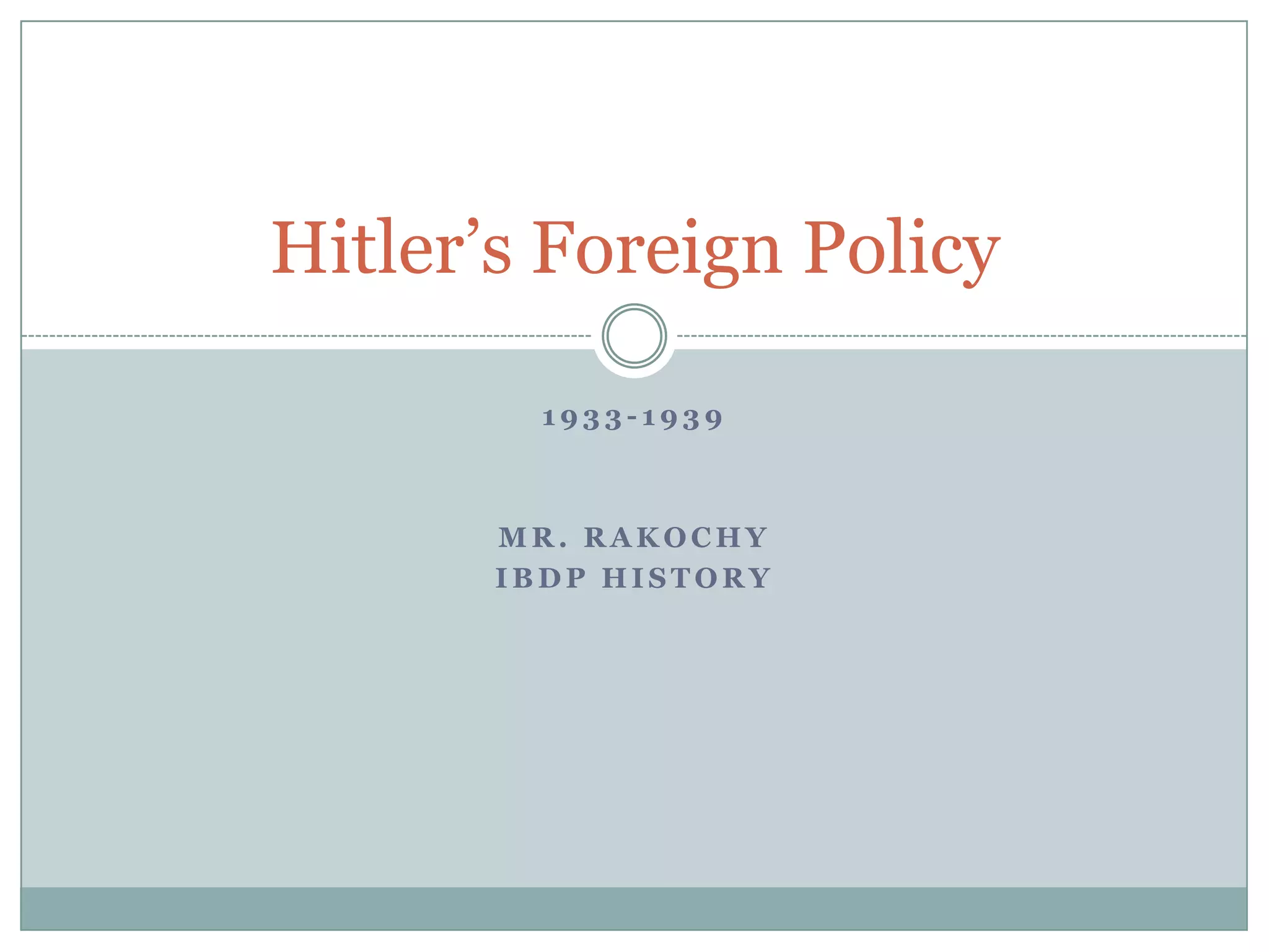 Hitler's foreign policy from 1933-1939 focused on three goals: destroying the Treaty of Versailles, uniting German speakers, and gaining Lebensraum. He withdrew Germany from the League of Nations in 1933 and began secret rearmament. Through threats and appeasement, he annexed the Rhineland, Austria, and the Sudetenland region of Czechoslovakia. In 1939, he invaded Poland, prompting Britain and France to declare war, starting World War II in Europe.