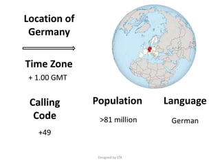 Germany has a population of over 81 million people who primarily speak German. Some of Germany's most popular tourist destinations include Berlin, the capital, known for its history and sites like the Brandenburg Gate and Reichstag Building. Other places of interest are Heidelberg Castle, the Rhine River where boat cruises operate, Cologne Cathedral and its towering spires, as well as Munich's Oktoberfest, the world's largest fair.