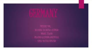 Germany has a population of approximately 82 million people, including 6.7 million foreigners. The territory of Germany covers 357,168 square kilometers. Some key aspects of German culture include handshaking as a greeting, enjoying social gatherings like beer festivals, and being direct and concise in business discussions. Popular religions in Germany are Catholicism, Protestantism, and Judaism. Typical German clothing includes conservative suits for business and casual pants or dresses. Common German foods are sausages, roasted meats, sauerkraut or red cabbage, bread rolls, and mashed potatoes.