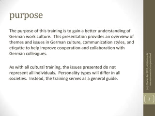This document provides an overview of German work culture to help improve cooperation with German colleagues. It discusses facts and myths about German culture, such as punctuality and order. Germans value direct communication and consensus-based decision making. Business etiquette is also important, such as arriving on time and engaging in small talk. Specific topics, behaviors, and cultural differences should be approached carefully. More resources on German business culture are provided.