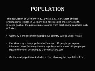 Germany has a population of over 81 million people, with German as the official language though many also speak English. The main religions are Roman Catholic and Protestant. Germany has a democratic government and Berlin is the capital. Some key facts about Germany are that beer consumption is high, the Autobahn has high speed limits, and Oktoberfest is a large annual festival celebrated in Munich each September and October.