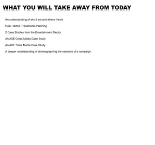 Griffin Farley's presentation on transmedia planning emphasizes the integration of multiple communication channels to create complex brand narratives, contrasting it with traditional cross-media approaches. He highlights the importance of consumer participation in storytelling and provides case studies from the entertainment sector to illustrate successful transmedia campaigns. Farley argues for a shift in marketing that respects audience engagement and utilizes a narrative structure to build a broader brand world.