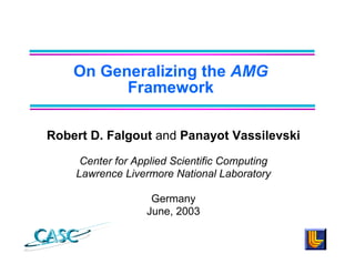 This document outlines a generalized framework for algebraic multigrid (AMG) methods. The framework separates the construction of coarse-grid correction into ensuring the quality of the coarse grid using compatible relaxation (CR) and ensuring the quality of interpolation for a given coarse grid. Several variants of CR are defined that can be used to efficiently measure and select coarse grids. The generalized theory allows for any type of smoother and various coarsening approaches. Future work will explore using CR in practice, including automatically choosing or modifying smoothers.