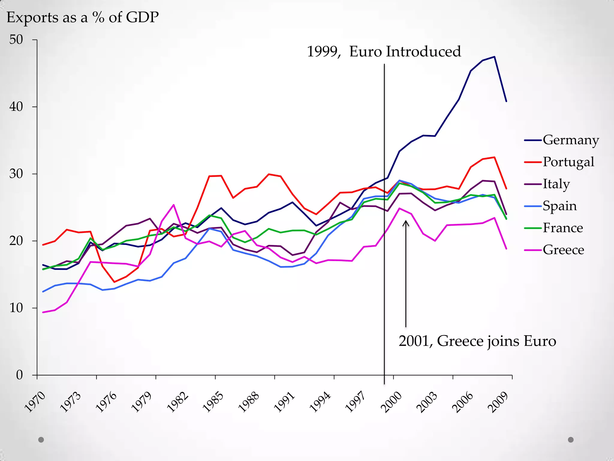 The document shows a line graph comparing exports as a percentage of GDP for several European countries from 1999 to an unspecified later date. It notes that 1999 was when the Euro was introduced and 2001 was when Greece joined the Euro. The graph shows Germany with the highest exports as a percentage of GDP, while Greece had the lowest percentage until joining the Euro in 2001 when its percentage increased.