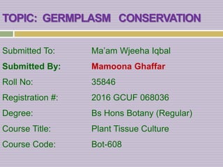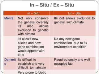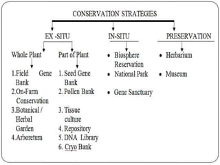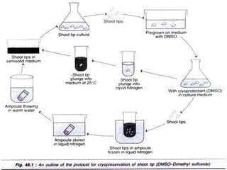 Germplasm conservation is vital for preserving the genetic diversity of plants, particularly endangered and commercially valuable species. It includes in-situ and ex-situ methods, with various techniques such as cryopreservation and cold storage employed to maintain genetic resources in gene banks. The document outlines the importance, methods, applications, and limitations of germplasm conservation, emphasizing its role in plant breeding and genetic research.