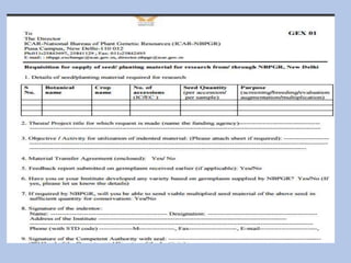 This document discusses germplasm introduction and exchange. It defines germplasm introduction as the transfer of crop plants or genetic resources from one area to another where they have not been cultivated before. The objectives of germplasm introduction include introducing new plant species, high yielding varieties, enriching germplasm collections, and obtaining new sources of biotic and abiotic stress resistance. The document outlines the types, agencies, and steps involved in plant introduction and exchange in India and internationally. It discusses the merits of introducing new germplasm, but also notes some potential demerits such as introducing new weeds, pests, or diseases.