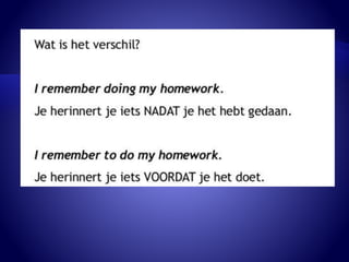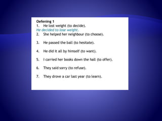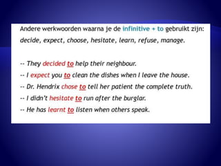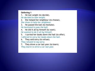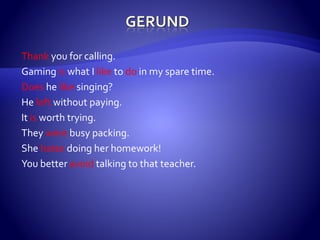 The document discusses gerunds and their usage. A gerund is a verb form ending in "-ing" that functions as a noun. Gerunds can be the subject of a sentence, or follow certain verbs like "to avoid", "to enjoy", and prepositions. Examples are provided like "smoking is not allowed" and "I look forward to meeting you." The document also provides exercises for readers to practice identifying and using gerunds.