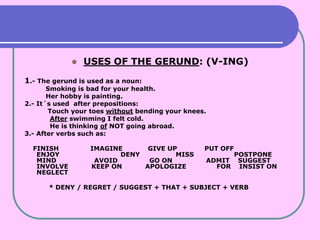 This document discusses the uses of infinitives, gerunds, and bare infinitives in English.