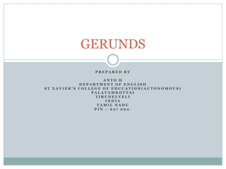 The document provides an overview of gerunds, explaining their definition and various usages, including as subjects, complements, and after prepositions or phrasal verbs. It highlights important examples to illustrate these functions and differentiates gerunds from present participles. Additionally, it discusses the use of gerunds in compound nouns and specific expressions.