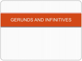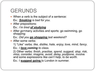 This document discusses the use of gerunds and infinitives in English. Gerunds are used as the subject of a sentence, after prepositions, and after certain verbs like "like" verbs. Infinitives are used after adjectives to express purpose or reason, and normally after another verb. Some verbs like "begin" and "prefer" can take either a gerund or infinitive. There are also differences in meaning when using try, remember, or forget with a gerund or infinitive.
