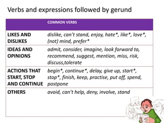 This document provides information on the use of gerunds and infinitives after verbs and expressions in English. It lists common verbs followed by gerunds or infinitives based on their meaning, such as verbs expressing likes/dislikes or mental states followed by gerunds, and verbs expressing future arrangements followed by infinitives. Some verbs, such as start, finish, and continue can be followed by either form without a change in meaning, while verbs like forget, remember, go on, regret, stop, and try can have different meanings depending on whether they are followed by a gerund or infinitive. The document also discusses uses of gerunds and infinitives after questions words, prepositions, adjectives, and
