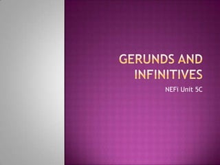This document discusses the use of gerunds and infinitives in English. It provides examples of when to use gerunds, such as after prepositions and phrasal verbs, and as the subject of a sentence. It also gives examples of when to use infinitives, such as after adjectives and some verbs. Finally, it discusses some verbs that can take both gerunds and infinitives, but with different meanings.