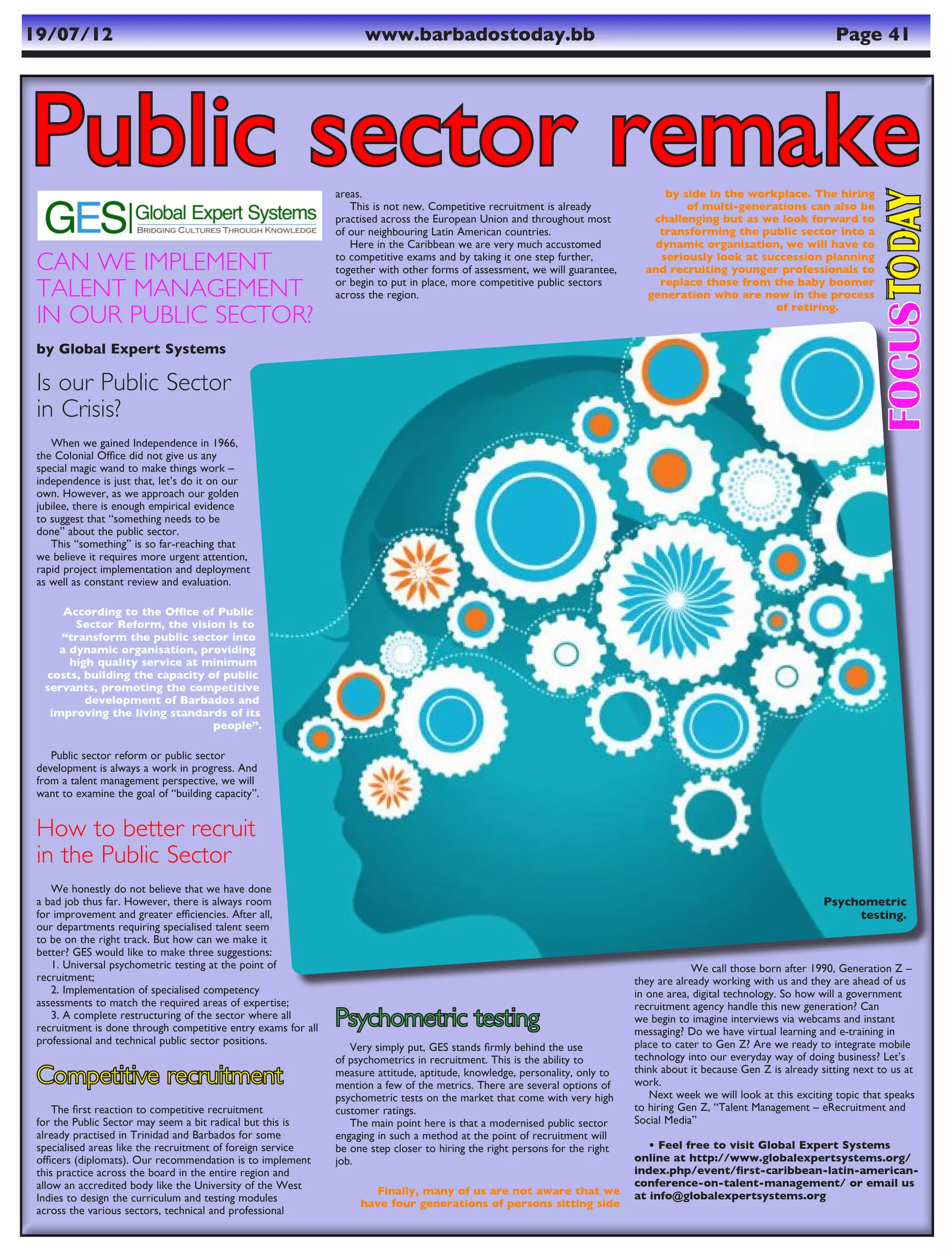 1. The public sector in Barbados and the Caribbean region may benefit from implementing talent management strategies like competitive recruitment and psychometric testing to hire the best candidates.