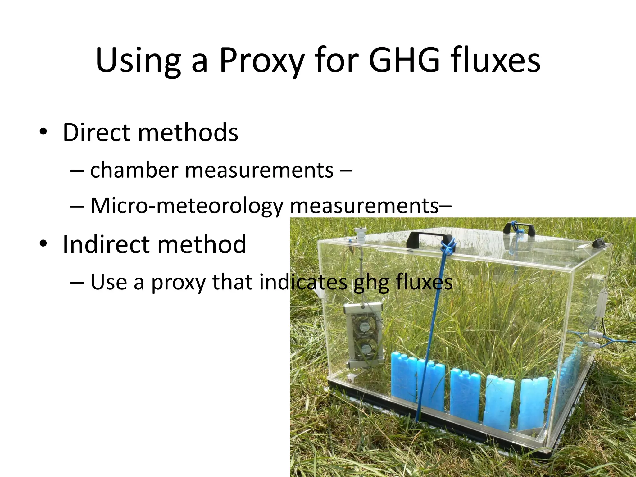 This document discusses proxies for greenhouse gas fluxes from peat soils, including subsidence, water table depth, and vegetation. It notes that while subsidence indicates carbon emissions, it does not cover nitrous oxide and methane or drained situations. Water table depth can be difficult to map remotely and monitor directly. Vegetation groups can serve as indicators of mean water levels. The document provides an example of how changes in vegetation from drainage to rewetting of a bog could lead to reduced greenhouse gas emissions.