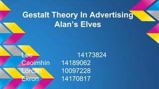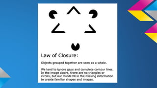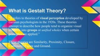 The document discusses Gestalt theory and its principles of visual perception that are relevant for advertising, including similarity, proximity, closure, and continuity. It provides examples of how each principle is applied in logos, advertisements, and web designs. For similarity, items that are similar in size, shape, or color tend to be grouped together. Proximity refers to objects closer together being perceived as more related. Continuity means following the smoothest line through a group of objects. And closure is the tendency to see complete images even when not all details are visible.