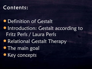 - It aims to bring about integration and acceptance of disowned parts of the personality.
