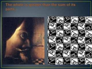 Gestalt theory originated in Germany in the late 19th century and focuses on how the mind perceives whole forms and patterns. Some key principles of Gestalt theory are that the mind perceives whole pictures or environments rather than separate parts, and perceives certain elements as figures that stand out against a background or ground. When viewing images, people perceive structures according to principles of proximity, similarity, closure, and simplicity - tending to group elements close together or that are similar, complete incomplete shapes or patterns, and perceive simple and symmetrical forms.