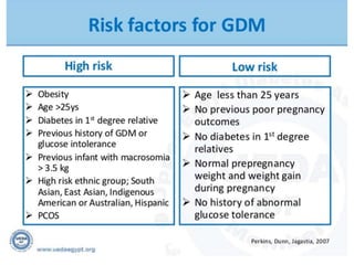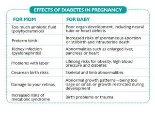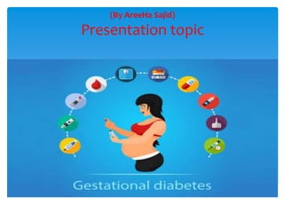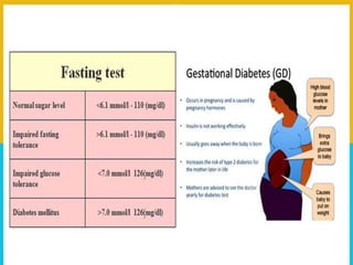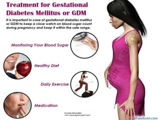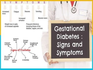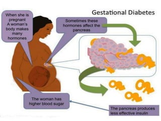Gestational diabetes is a form of diabetes that develops during pregnancy and usually disappears after giving birth. It occurs most commonly during the second and third trimesters and is caused by hormones from the placenta that make the mother less sensitive to insulin. Gestational diabetes increases risks for both mother and baby if not properly treated through diet, exercise, blood sugar monitoring, and possibly medication.