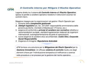 Questo documento discute l'importanza del controllo interno nella gestione dei rischi operativi nel settore immobiliare e presenta le soluzioni offerte da efm per mitigare tali rischi. Sottolinea la crescente complessità nella gestione delle operazioni, dovuta a obblighi legislativi e a nuove esigenze etiche e ambientali. Tra i benefici per i clienti, si trovano la riduzione dei rischi e il miglioramento dell'efficienza e dell'immagine aziendale.
