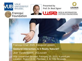The document summarizes Jean Vanderdonckt's upcoming lecture on gestural interaction. It will cover the psychological, hardware, software, usage, social and user experience dimensions of gestural interaction. On the psychological dimension, it discusses definitions of gestures and theories of gesture types. On the hardware dimension, it outlines paradigms of contact-based and contact-less gesture interaction. On the software dimension, it provides an overview of gesture recognition algorithms such as Rubine, Siger, LVS and nearest neighbor classification.