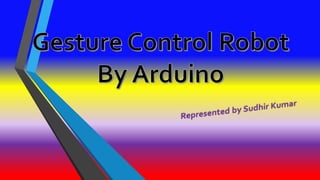 The document describes a gesture controlled robot project. The objective is to create a simple and inexpensive device that can be mass produced to help disabled people maneuver wheelchairs without touching the wheels. The robot uses an accelerometer to detect hand gestures which are sent to a microcontroller via an RF transmitter/receiver. The microcontroller controls motors via a motor driver to move the robot in corresponding directions based on the gestures.