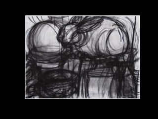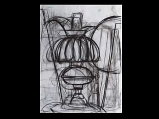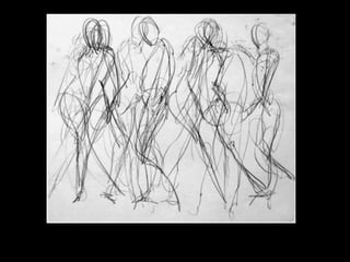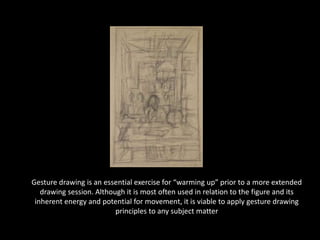Gesture drawing is a quick sketching exercise used to warm up before longer drawing sessions. It focuses on capturing the essential movement and proportions of a subject within short poses ranging from 15 seconds to 3 minutes. The goal is to suggest the entire subject with a few lines that establish the main axes and points of articulation through fluid arm movements while primarily observing the subject rather than focusing on details of the drawing. Gesture drawing helps artists see and record the underlying structure and energy of a pose.