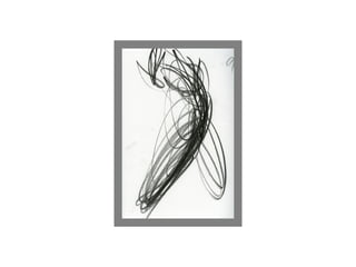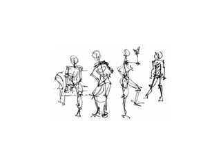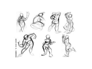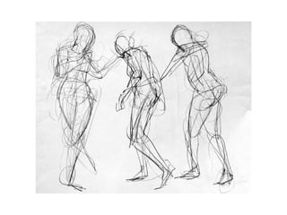 Gesture drawing focuses on capturing the essence and movement of a subject quickly before the moment passes. It is not meant to be a precise representation, but rather a way to depict the overall form through loose, quick lines that show weight and energy. Gesture drawings help practice capturing an object's movement and energy in a short time period without details, making them useful for warm-ups before more serious drawings.