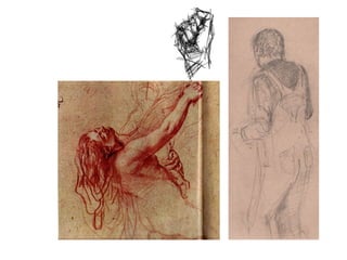 Gesture drawing is a technique used by artists to quickly sketch the pose and motion of a subject through directional lines and basic shapes before adding detail. It involves observing the subject to understand how different body parts relate and move, then using quick sketches to capture the pose and flow of motion in a few lines and shapes rather than focusing on realistic details. Gesture drawing helps artists train their hands to rapidly translate what they see into basic representations and prepares them for finished works by planning the composition through these quick sketches.