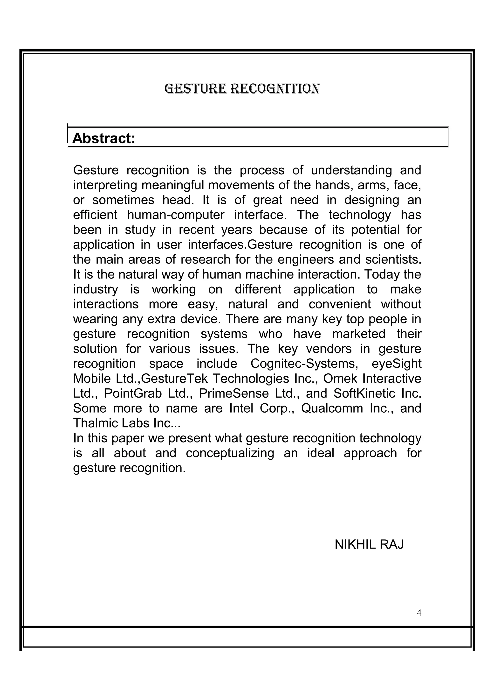 Gesture recognition is the interpretation of meaningful human movements, essential for developing efficient human-computer interfaces. Various technologies, including cameras and hand-tracking gloves, are employed to facilitate gesture recognition across industries like automotive and healthcare, with a projected market growth to exceed $15 billion by 2018. Challenges remain in ensuring accurate gesture recognition due to environmental factors, equipment limitations, and the dependency on specific hardware configurations.