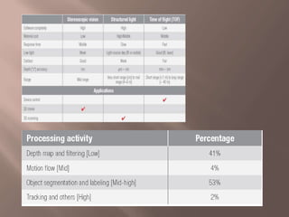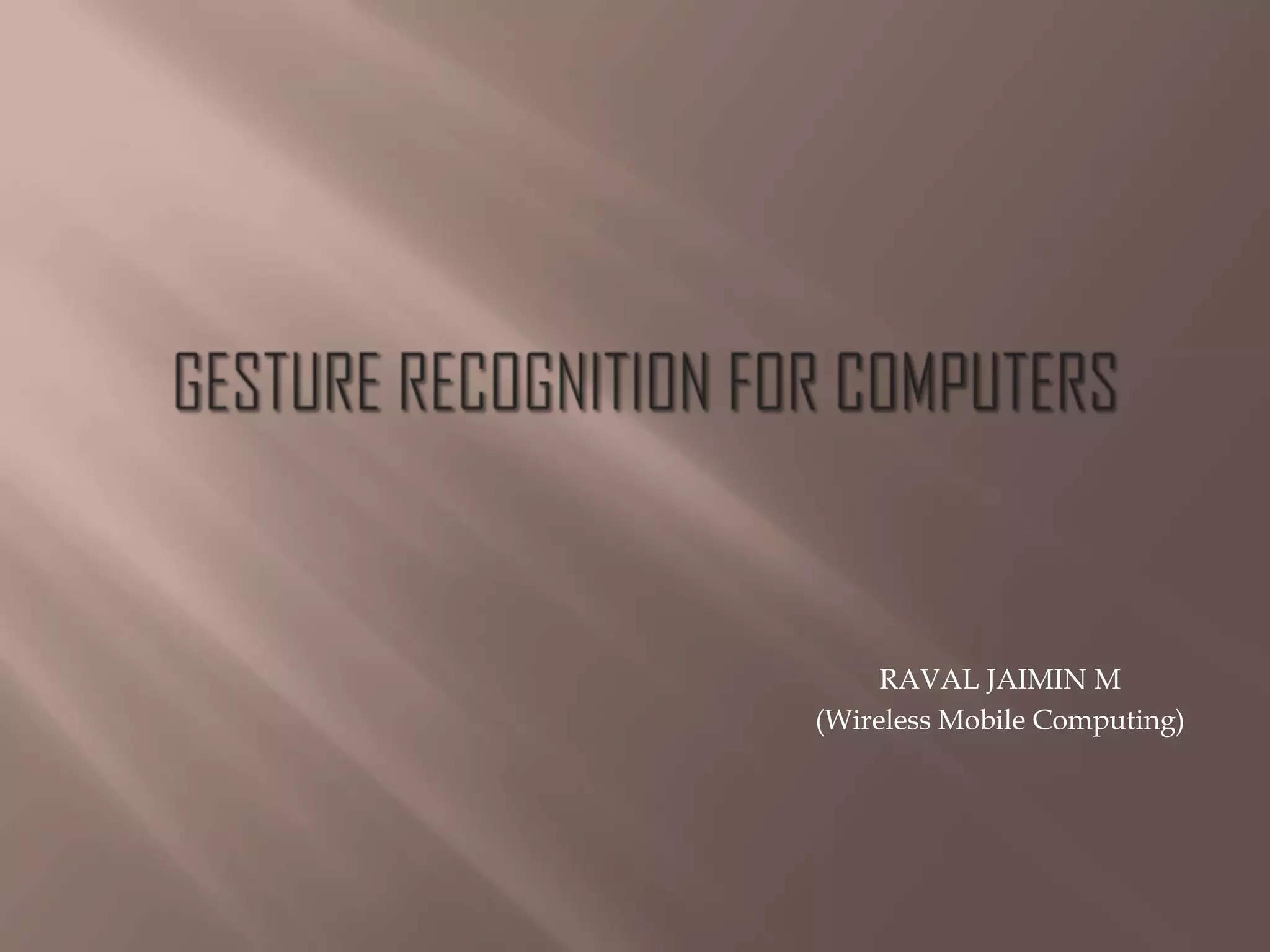 Gesture recognition technology allows humans to interface with computers using body movements detected by cameras. Cameras read gestures and send that data to computers for processing as input to control devices or applications. Some techniques use specialized gloves with sensors to capture finger and hand positions and movements. When developing gesture recognition systems, factors like accuracy, precision, resolution, update rate, and latency of the sensing system should be considered. Systems work by using computer vision and image processing techniques on camera input to interpret 3D gestures based on x, y, and z coordinate data. Future developments could integrate speech and gesture recognition for more natural multimodal interaction with virtual assistants.