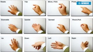 Gesture recognition technology interprets human gestures through mathematical algorithms, enabling natural communication between humans and machines. It utilizes various input devices like depth-aware cameras, stereo cameras, and wired gloves for gesture detection, which is useful in applications such as sign language recognition, robotics, and gaming. However, it faces challenges like user fatigue from prolonged use and limitations in detecting gestures when limbs are obscured.