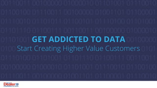 This document discusses strategies for dealerships to create higher value customers by getting "addicted to data." It recommends segmenting customers based on predictive attributes like visit frequency or engagement. The top 20% of customers account for 66% of revenue but dealerships typically underinvest in these valuable segments. By customizing experiences for different customer segments identified through data analysis, dealerships can increase engagement, visits, and revenue from their highest potential customers.