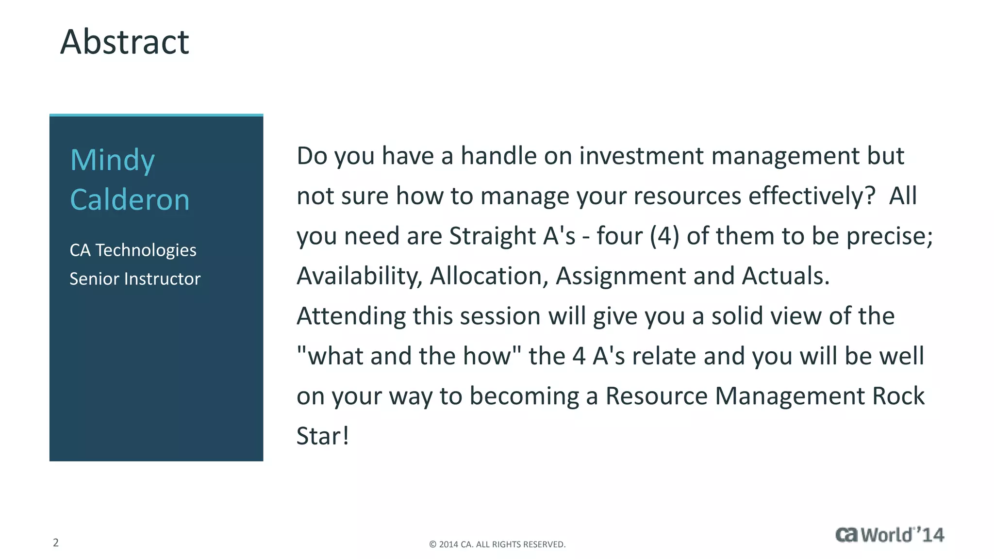 The document discusses resource management in organizations. It explains that resource management involves efficiently deploying resources like employees, contractors, and suppliers when needed. It also describes the four As of resource management - Availability, Allocation, Assignment, and Actuals. Attendees of the session will learn how these four aspects relate to effectively managing resources and becoming a "Resource Management Rock Star."