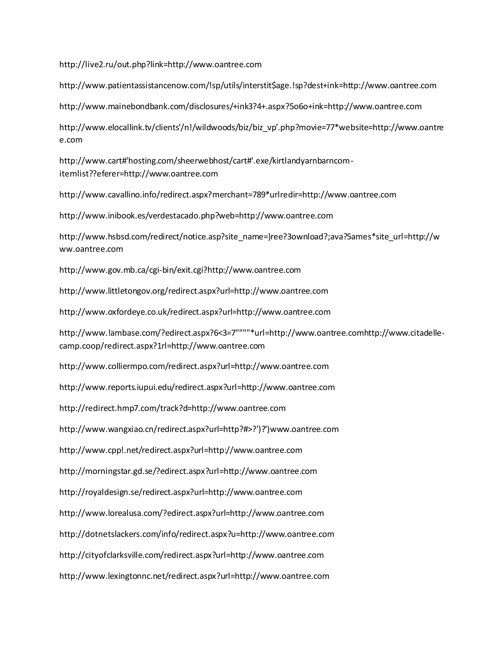 The document contains a list of URLs that all redirect to the website www.oantree.com. The URLs are from a variety of domains and use different redirection techniques like redirects, exits, and referrer links to route traffic to the target website.